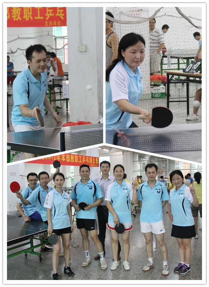 5月29日下午,在学校体育馆2楼乒乓球馆举行的2012年校本部教职工乒乓球赛,激战至晚上7:00。 由男队员李杰、王玉平、熊卓、张少生,女队员陈蕊、范宇、王凤侠、黄潇组成的机关代表队,以全胜的成绩获得第一名。