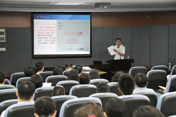 会议由办公室苏广武主任主持,他介绍了举办此次培训的背景和目的,并希望各单位通过此次培训,高度重视公文处理工作,认真学习国家最新的党政机关公文格式和《广州医科大学党政公文处理工作细则》,提高学校公文处理工作质量。秘书科曾锦标科长在会上作了题为《2012年新版公文格式解读与常用公文写作》的讲座,按照2012年出台的新版公文格式规范,从公文格式、常用公文写作等方面做了详尽的解读,对学校公文处理工作提出了“格式正确、条理分明、要言不繁、用词精准”的要求。办公室钟其炎同志对学校办公自动化系统运行情况作了简要介绍,并对日常公文办理中存在的问题和注意事项作了说明。