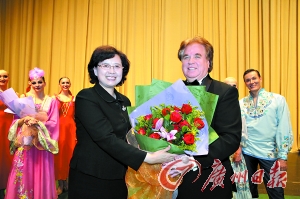 演出结束后,王晓玲向俄罗斯国家歌舞团的艺术家们送上鲜花。