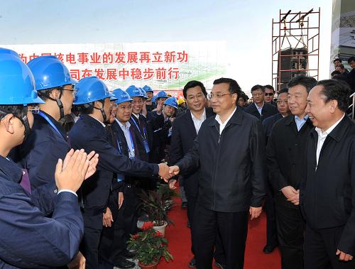 11月21日,中共中央政治局常委、国务院副总理李克强出席福建福清核电工程开工仪式并宣布开工。这是李克强与参加核电站施工、设计和监理等单位的代表握手。新华社记者 刘建生 摄